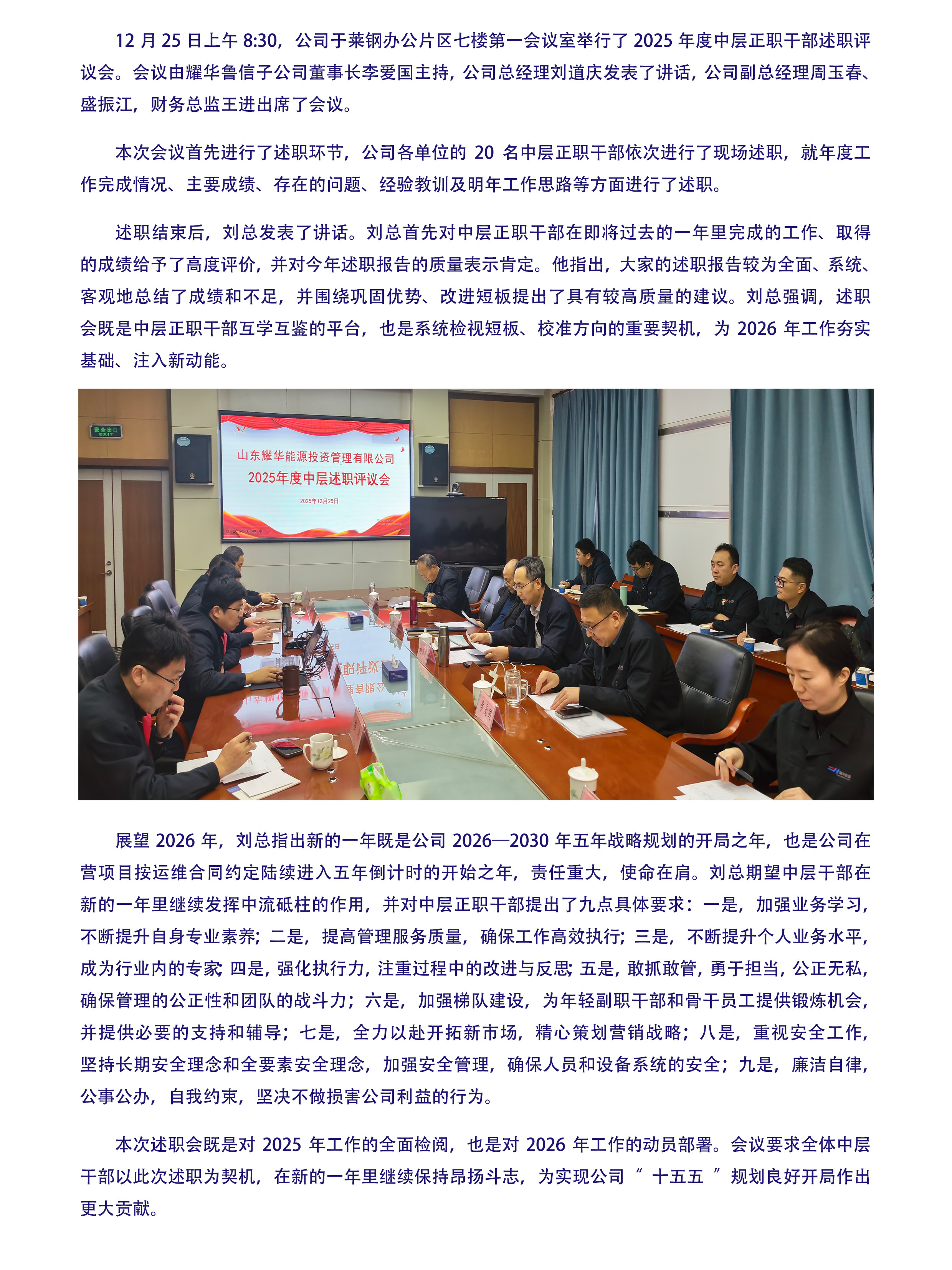 2025年12月25日,公司召开了2025年度中层正职干部述职评议会