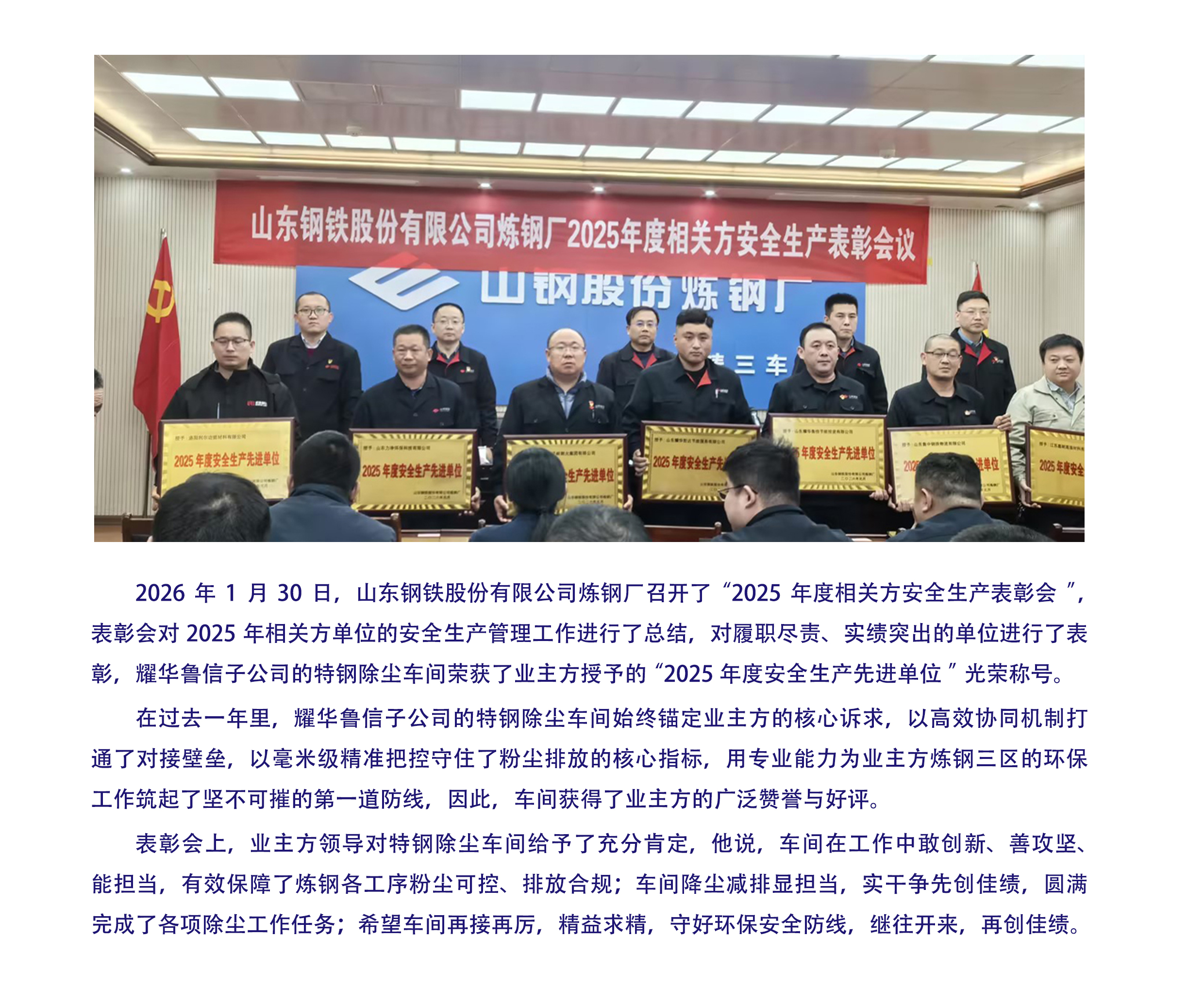 2026年1月30日,特钢除尘车间荣获业主方表彰